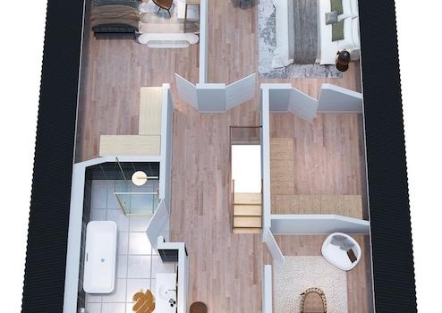 Ergänzt wird das Raumangebot durch eine separat vom Hauptflur zugängliche, offen gestaltete 2-Zimmer-Wohnsuite mit fließendem Übergang zwischen Schlaf-, Wohn- und Arbeitsbereich – ideal als Jugendbereich, Homeoffice oder komfortabler Rückzugsort für Gäste bzw. ein Familienmitglied, optimal ergänzt durch das Duschbad im Obergeschoss.