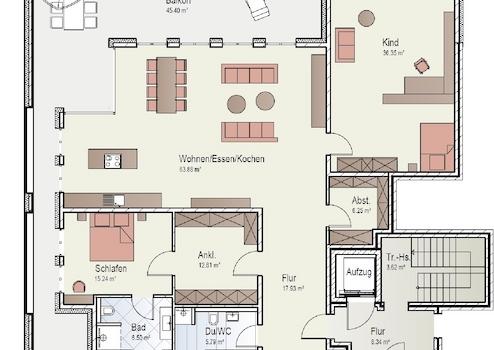 Die Penthouse Wohnung ist selbstverständlich barrierefrei über einen Personenaufzug zu erreichen, der vom Kellergeschoss mit Fahrrad- und Kinderwagenabstellbereich sowie Entsorgungsraum bis zu allen Wohnetagen führt.