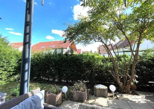 Eine große, teilüberdachte Sonnen-Terrasse mit Gartenanteil lädt zum Verweilen und Entspannen ein.