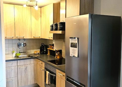 - Gepflegte Einbauküche mit allen Elektrogeräten: großer Kühlschrank (Kühl/Gefrier), Spülmaschine, Herd/Backofen