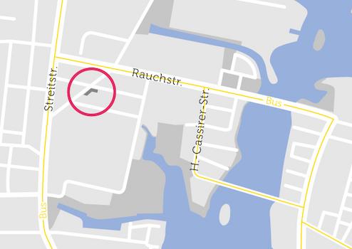 Das Grundstück liegt im Spandauer Stadtteil Hakenfelde, nördlich der Altstadt, zwischen Streitstraße und Havel. Zur Spandauer Altstadt beträgt die Entfernung 2,8 km. Sie erreichen die Busse 136, 236, X36, N34 und N39 fußläufig innerhalb von drei Minuten. Die Nahversorgung ist durch verschieden Supermärkte gewährleistet.