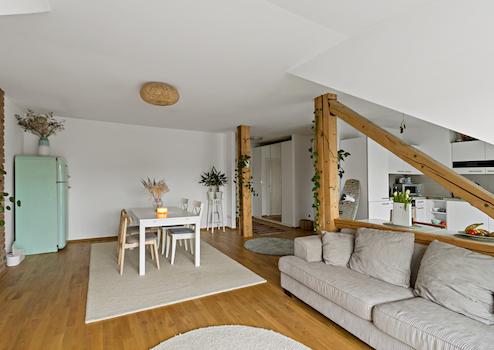Der Mittelpunkt der Wohnung ist das große Wohnzimmer mit seinen charmanten sichtbaren Holzbalken. Hier entsteht eine Atmosphäre voller Wärme und Wohnlichkeit – ideal für entspannte Abende mit der Familie oder gesellige Stunden mit Freunden. Große Fensterflächen sorgen für lichtdurchflutete Räume und unterstreichen die elegante Ausstrahlung.