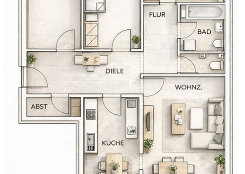 Bereits beim Betreten der Wohnung spüren Sie die angenehme Großzügigkeit. Die weitläufige Diele erschließt alle Räume optimal und unterstreicht den funktionalen Grundriss. Das Herzstück bildet das großzügige Wohn- und Esszimmer mit großen Fensterflächen, die für ein lichtdurchflutetes, einladendes Ambiente sorgen. Von hier aus gelangen Sie direkt auf die gemütliche Loggia – ein geschützter Platz für entspannte Stunden im Freien.