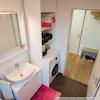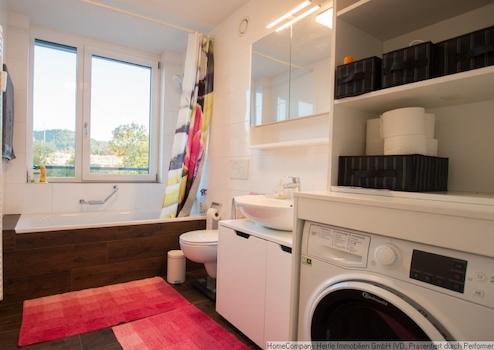 Wanne, WC, beleuchteter Allibertschrank, Regal, Waschtrockner,