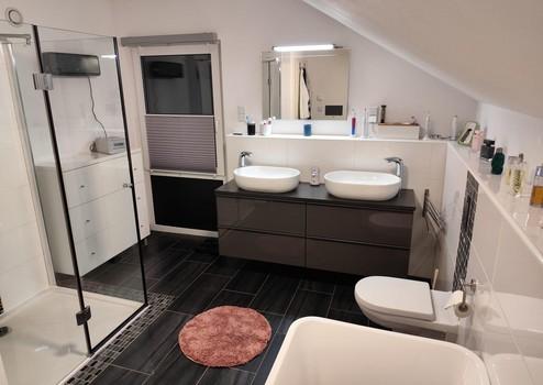 Ein besonderes Highlight bildet das großzügige Tageslichtbad mit moderner Walk-in-Dusche, Badewanne sowie Doppelwaschtisch. Die Kombination aus großformatigen Fliesen, dunklen Akzenten und klaren Linien verleiht dem Raum eine exklusive, fast spa-ähnliche Atmosphäre.