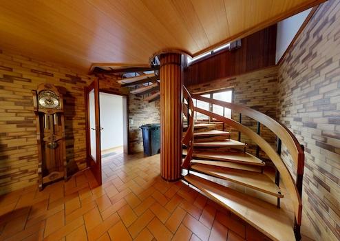 Über die wunderschöne, imposante Wendeltreppe gelangt man in die oberen Etagen des Hauses. Diese Treppe stellt nicht nur eine funktionale Verbindung zwischen den Geschossen dar, sondern ist zugleich ein architektonisches Highlight.