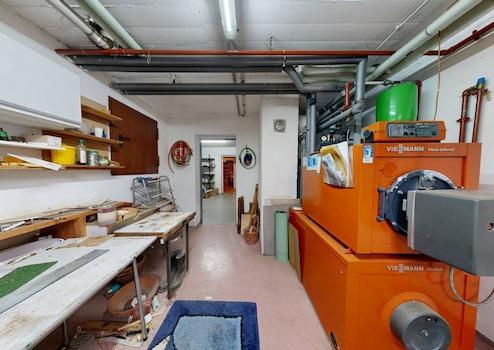 Das Erdgeschoss bildet gleichzeitig die Kellerebene und beherbergt den Hauseingang. Auf dieser Ebene befinden sich ein Partyraum, der Platz für gesellige Abende mit Familie und Freunden bietet, mehrere praktische Abstell- und Kellerräume sowie ein Heiz- und Tankraum. Direkt angebunden ist außerdem die Garage, die einen komfortablen Zugang zum Haus ermöglicht.