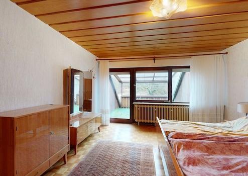 Im Obergeschoss erwartet Sie der zentrale Wohnbereich des Hauses. Das großzügige Wohn- und Esszimmer bietet viel Raum für individuelle Gestaltungsmöglichkeiten und schafft eine angenehme Wohnatmosphäre. Die Küche verfügt über einen direkten Zugang zur Terrasse und in den Garten. Durch die Hanglage genießen Sie hier eine besondere Aussicht und ein schönes Maß an Privatsphäre. Ergänzt wird diese Etage durch ein Büro, ein separates WC sowie ein Tageslichtbad, das mit einer Badewanne, einer Dusche und einem Fenster ausgestattet ist.