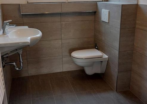 Modernes Bad: Zeitgemäße Sanitärobjekte und hochwertige Fliesen.