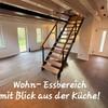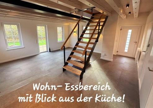 Der große, lichtduchflutete Wohn- und Essbereich mit der angrenzenden, offenen Küche mit wohnlichem Sichtmauerwerk und hellen Deckenbalken, wird ergänzt durch den direkt danebenliegenden Hauswirtschaftsraum mit Fenster.