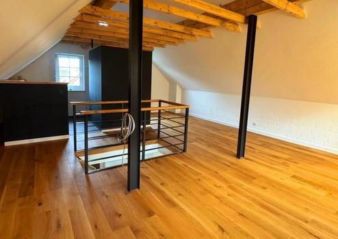 Die gesamte obere Etage besteht aus einem sehr großen Schlafbereich mit hohen Decken, offenem Sprengwerk und hochwertigen Holzdielen, ebenfalls aus massivem Eichenholz.
