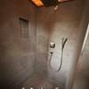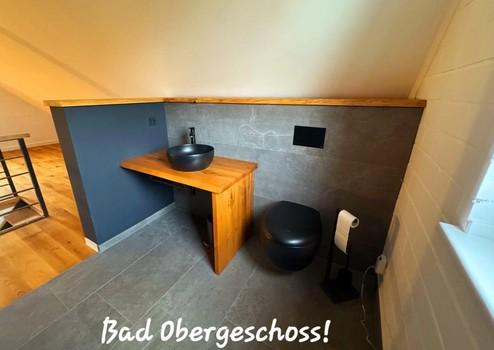 Das direkt angrenzende, offen gestaltete und luxuriöse Bad, ebenfalls mit großformatigen, dunkelgrauen italienischen Fliesen (aus dem EG) auf Böden und Wänden der ebenerdigen, großen Regendusche wurde auch mit schwarzem Aufsatzwaschbecken und schwarzem Hänge WC ausgestattet (HansGrohe & Vitra) und wurde durch stilvoll geplante warme Holzelemente abgerundet!