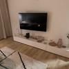 Wohnzimmer mit Sitzgarnitur + Fernseher + Tisch + Teppich + Vorhänge
