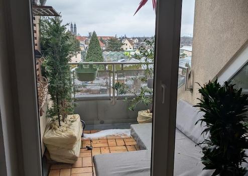 Der offen gestaltete Wohn- und Essbereich bildet das Herzstück der Wohnung. Große Fensterflächen schaffen eine freundliche Wohnatmosphäre und ermöglichen den Zugang zur geschützten Loggia mit schönem Weitblick über die Dächer von Dresden-Strehlen. Hier genießen Sie angenehme Privatsphäre und eine ruhige Rückzugsmöglichkeit im Freien.
