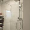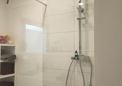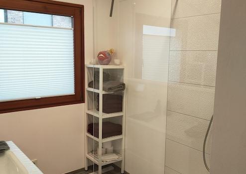 Badezimmer mit Fenster und ebenerdige Dusche.