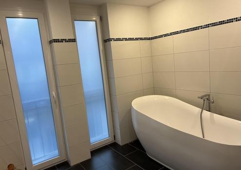 Ihre private Spa-Oase: Das stilvoll ausgestattete Hauptbadezimmer mit freistehender Badewanne vermittelt echte Spa-Atmosphäre. Ein zweites Badezimmer sowie ein separates Gäste-WC runden das komfortable Angebot ab.