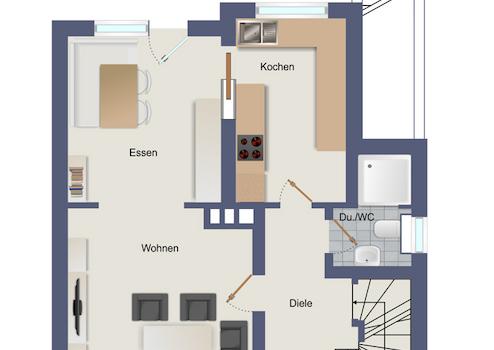 Erdgeschoss: Wohn-Essbereich mit Zugang zur Terrasse, Küche, Diele mit Gäste-WC und Dusche