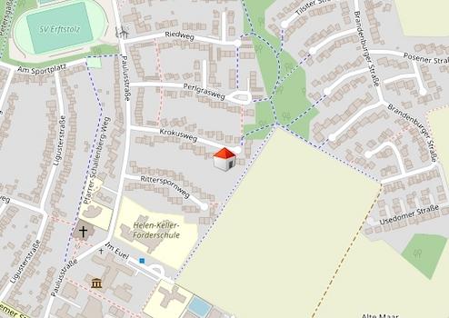 Das angebotene Haus liegt in einer ruhigen Stichstraße mit gleichartiger Bebauung.