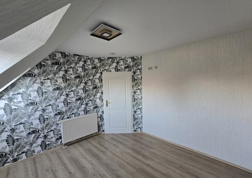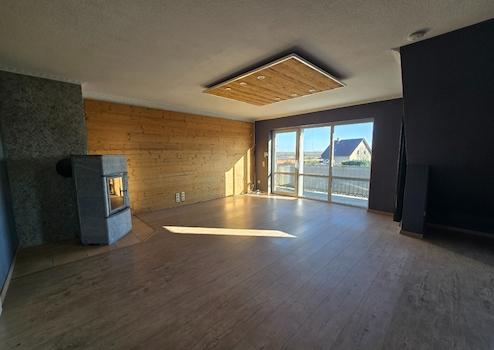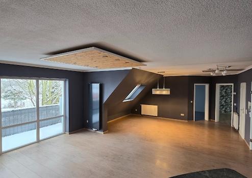 Trotzdem sich die Wohnung im Dachgeschoss befindet, hat sie einen separaten Ein-/Aufgang. Das helle und großzügige Wohnzimmer mit Essbereich besticht durch den Kamin, der für die Gemütlichkeit sorgt und den Balkon mit Blick ins Grüne; er lädt zum Entspannen ein.