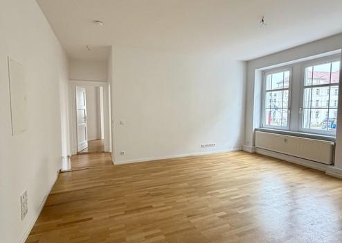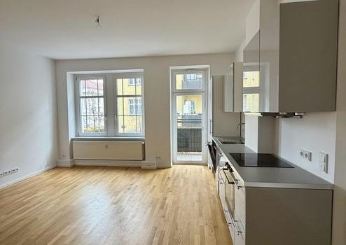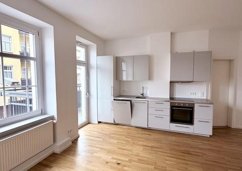 Die Wohnung selbst überzeugt vor allem mit dem Grundriss: Auf 72 Quadratmetern finden sich ein großes Wohn-Esszimmer mit offener Einbauküche, zwei Schlafzimmer und ein Tageslichtbad. Der Balkon ist über die Küche zugänglich, was auch für WG-Vermietung ideal wäre.