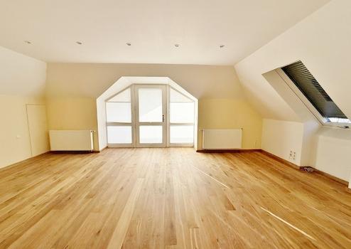 Eine massive Treppe führt sowohl in den Keller als auch ins Dachgeschoss. Das Dachgeschoss bietet viel Platz für Kinder, Gäste oder einen separaten Arbeitsbereich. Hier befinden sich ein großzügiges Zimmer mit Zugang zur Loggia, ein weiteres Zimmer sowie ein modernes Duschbad. Zusätzlich steht Ihnen eine ca. 50 m² große Dachbodenfläche zur Verfügung, die aktuell als Stauraum genutzt wird, sich aber mit Aufwand auch zu weiterem Wohnraum ausbauen ließe.