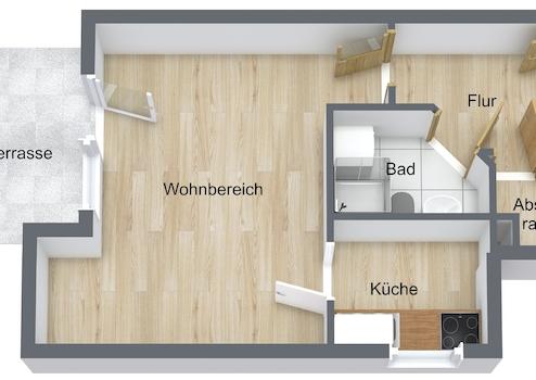 Moderne Wohnanlage, Suhl, unterhalb vom Döllberg, Flur, Abstellraum Bad mit Dusche, WC, Handwaschbecken und Waschmaschinenanschluß, Wohn-und Schlafbereich, Terrasse