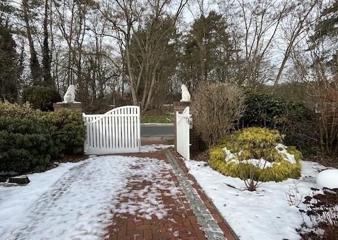 Bereits von außen vermittelt die verklinkerte Fassade im klassischen Rot, eingebettet in ein rund 894 m² großes Grundstück mit gepflegter Bepflanzung, ein einladendes Bild. Das elegante Eingangstor und die gesäumten Beete verstärken den repräsentativen Charakter.