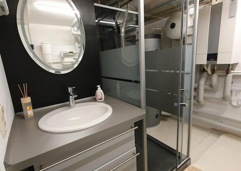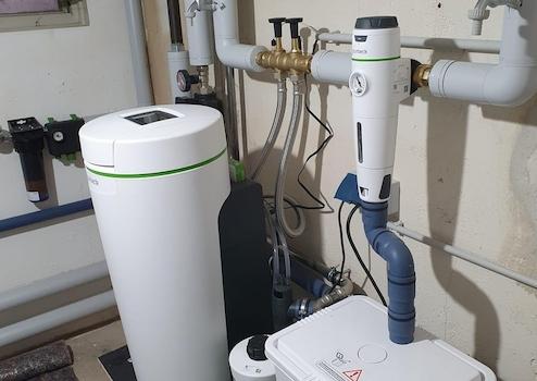 Heizraum mit neuer Dusche, Waschbecken, Wolf Wärmepumpe als Heizung und moderner Grünbeck-Entkalkungsanlage