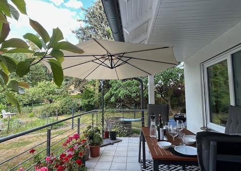 Die nach NO ausgerichtete Veranda ist zu 2/3 überdacht. Das garantiert für schöne Morgensonne, Schatten in der Mittagszeit, einen orange angestrahlten Waldrand bei Sonnenuntergang und Schutz vor einem veregneten Abendessen.