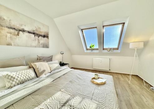 Die großzügigen Zimmer bieten ausreichend Platz für Paare, kleine Familien oder das Arbeiten im Homeoffice.