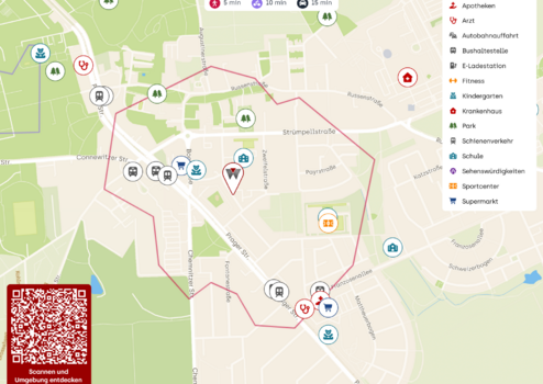 Nahgelegene Grünflächen und Parkflächen: innerhalb von 1–1,5 km