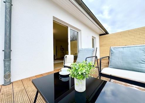 - Ca. 40 m² große, erhöhte Terrasse mit schönem Blick ins Grüne