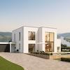 Die Stadtvilla 4 XL von STREIF bietet mit rund 194 m² Netto-Raumfläche großzügiges, modernes Wohnen auf zwei Vollgeschossen ohne Dachschrägen. Ein durchgängiger Erker mit zweigeschossigem Panoramafenster sorgt für lichtdurchflutete Räume, während der zweite Erker im Obergeschoss als exklusive Dachterrasse mit Blick auf den Rhein gestaltet ist.