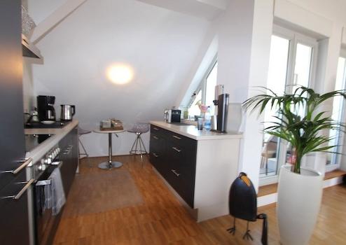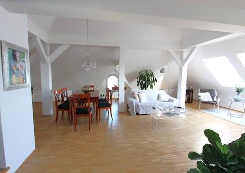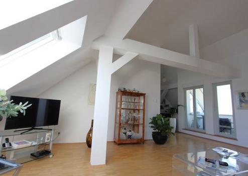 Wohnen mit Raumhöhe und Struktur - Die Wohnung beeindruckt durch ihre bis in den Giebel geöffneten Räume. Sichtbare Konstruktionsbalken und die klare Dachstruktur verleihen dem Wohnbereich eine besondere Tiefe und Authentizität.
