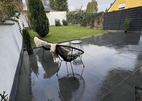 -Garten: Vergrößerung und Erneuerung der Terrasse. Legen eines Rollrasen