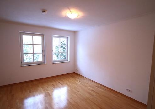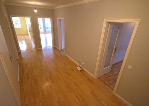 Echtholzparkett in Wohn- und Schlafräumen, Keramikfliesen im Sanitärbereich, Kunststoffbelag in der Küche