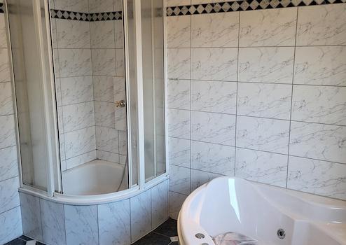 DAS BADEZIMMER IST MIT EINER HALBRUND DUSCHE,EINEM WHIRPOOL,EINEM BIDET,WC UND WASCHBECKEN AUSGESTATET EINE MODERNISIERUNG KÖNNTE HIER DAS POTENZIAL VOLL AUSSCHÖPFEN