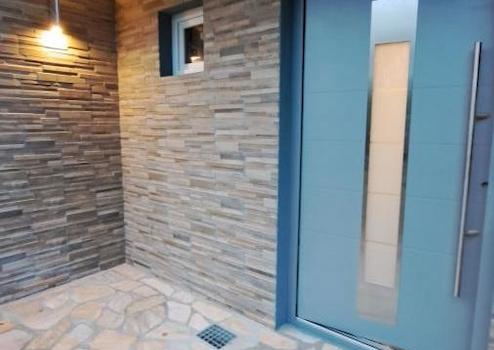 Die Terrasse und der Eingangsbereich sind mit Naturstein belegt; die Fassade frisch gestrichen und eine moderne Klingelreihe installiert.