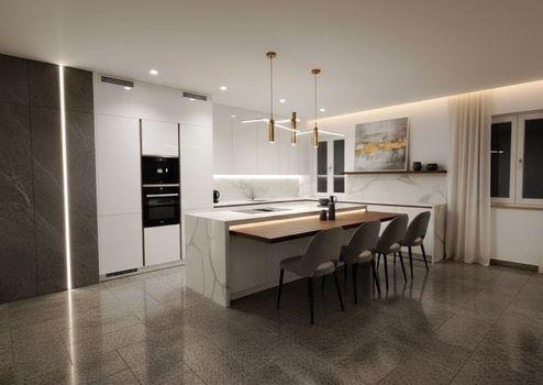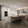 Das angrenzende riesige Esszimmer mit offener, großzügiger Küche schafft ein einladendes, kommunikatives Zentrum des Hauses - perfekt für Familienleben oder Gäste.