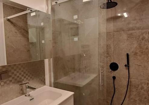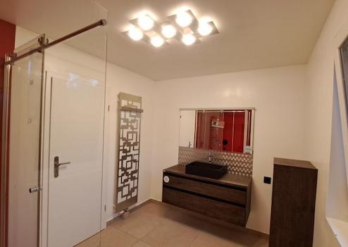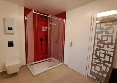 - Zwei Tageslichtbäder - eines im EG, eines im 1. OG - verfügen über Duschen (Firma Schulte, Große: 140 × 90 cm), Designer-Heizkörper, hochwertige Bademöbel und Luxus-WCs.