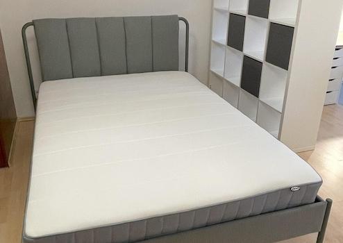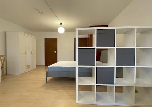Neben einem großen Bett verfügt das Apartment über ausreichend Stauraum in Schränken und Regalen. Ein gemütliches Sofa mit Couchtisch lädt zum Entspannen und Ausruhen ein. Ein Schreibtisch mit Office Schubladen und Drehstuhl ermöglicht das Homeoffice oder Studium zu Hause. In der Küche ist ausreichend Platz für das tägliche Kochen, um dann anschließend das Essen am Esszimmertisch und zwei Stühlen genießen zu können.
