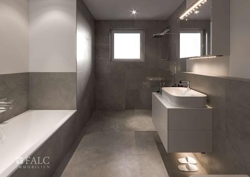 Das Badezimmer präsentiert sich als elegante Wohlfühloase mit bodengleicher Dusche inklusive Glasabtrennung, Badewanne, Waschtisch mit Unterschrank sowie WC von Villeroy & Boch. Hochwertige Armaturen von Grohe setzen zusätzliche Akzente. Die vollständige Sanitärausstattung ist im Kaufpreis enthalten.