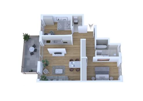 Über die Diele gelangen Sie in das Schlafzimmer sowie in das Masterbad. Die Bäder sind mit hochwertigen Design-Objekten - ganz im Trend der Zeit – ausgestattet.