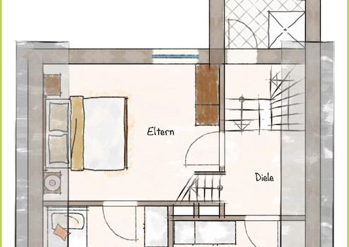 Dort befinden sich weitere 3 (Schlaf-)Räume, eine Diele mit Einbauschrank und ein weiteres Badezimmer. Der Dachboden - teilweise ausgebaut - ist durch eine Zugtreppe zu erreichen.