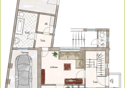 Im Erdgeschoss befinden sich die Küche mit Zugang zum Wohn- u. Essbereich sowie ein Badezimmer, ein Gäste-WC und die Diele mit Zugang zum Dachgeschoss.