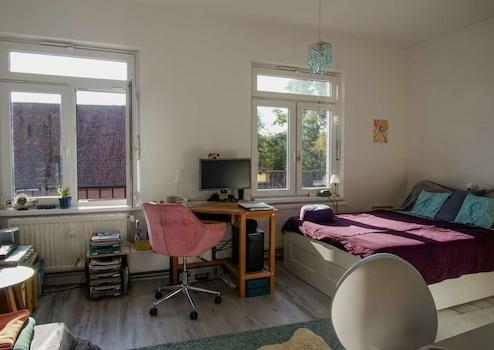 Vom Mobiliar kann gegen einen Betrag von 250,- € das Doppelbett mit Schubladen und der Kühlschrank übernommen werden.