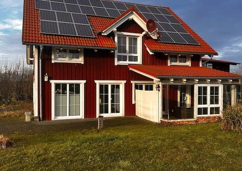 Mit einem nachgerüsteten Batteriespeicher wäre ein nahezu autarkes Wohnen möglich, dazu bistet das Scheunendach weiteres Potential für mehr Ertrag.