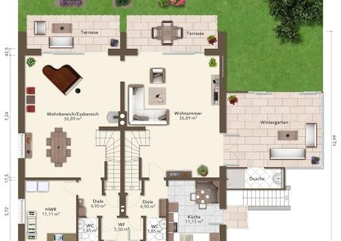 Hinweis: Zur hinteren, rechten Haushälfte gehört ein beheizter Wintergarten mit ca. 32m² Wohnfläche.