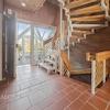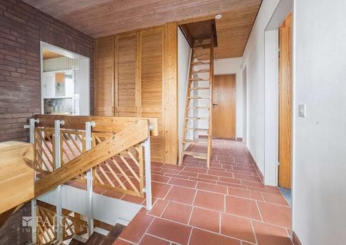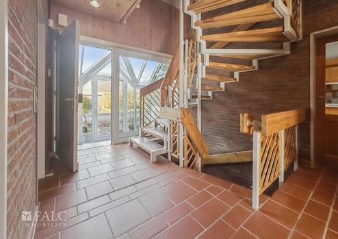 Schon bevor man durch die Haustür geht, fällt der gläserne Windfang ins Auge – eine praktische Erweiterung, die den Eingangsbereich trocken und angenehm macht. Drinnen empfängt ein freundlicher Flur mit der Holztreppe ins Dachgeschoss und in den Keller. Ein Gäste-WC liegt direkt im Eingangsbereich – genau da, wo man es im Alltag braucht.