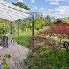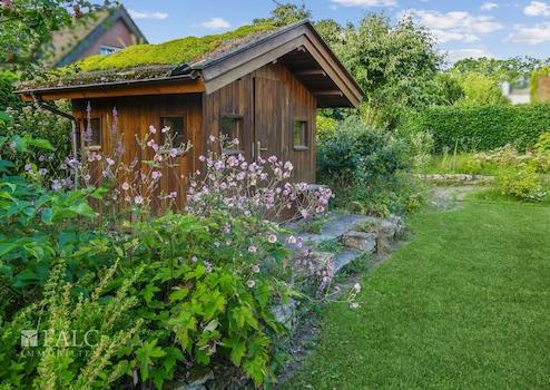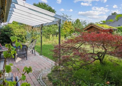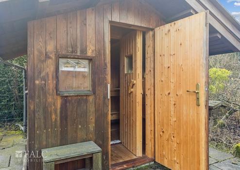 Besonders schön: Sowohl vom Wohn- als auch vom Essbereich gelangt man auf die überdachte Terrasse mit Glasdach. Eine große Markise sorgt bei Bedarf für Schatten. Dahinter wartet ein gepflegter, pflanzenreicher Garten mit Natursteinpflaster, sauber gefassten Beeten und vielen liebevollen Details. Ein echtes Highlight im Außenbereich ist das separate Saunahaus mit begrüntem Dach – ein besonderer Ort für ruhige Abende und kleine Auszeiten im eigenen Garten. Eine Garage rundet das Angebot ab.
